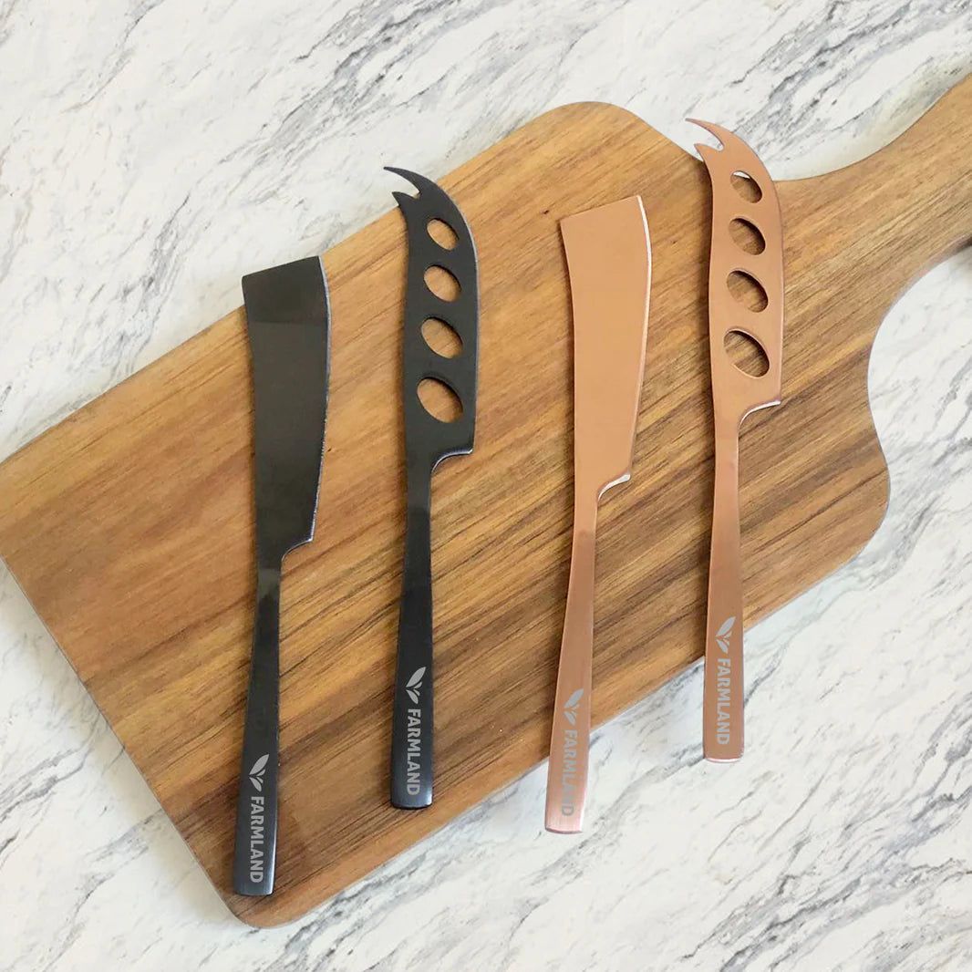 Prix incluant 1 impression 1 couleur de votre visuel à 1 endroit sur les 2 pots en céramique et sur l'ensemble huile et vinaigre ainsi que la gravure au laser sur les 2 couteaux à fromage. 3 frais de matrice et de transport applicables
