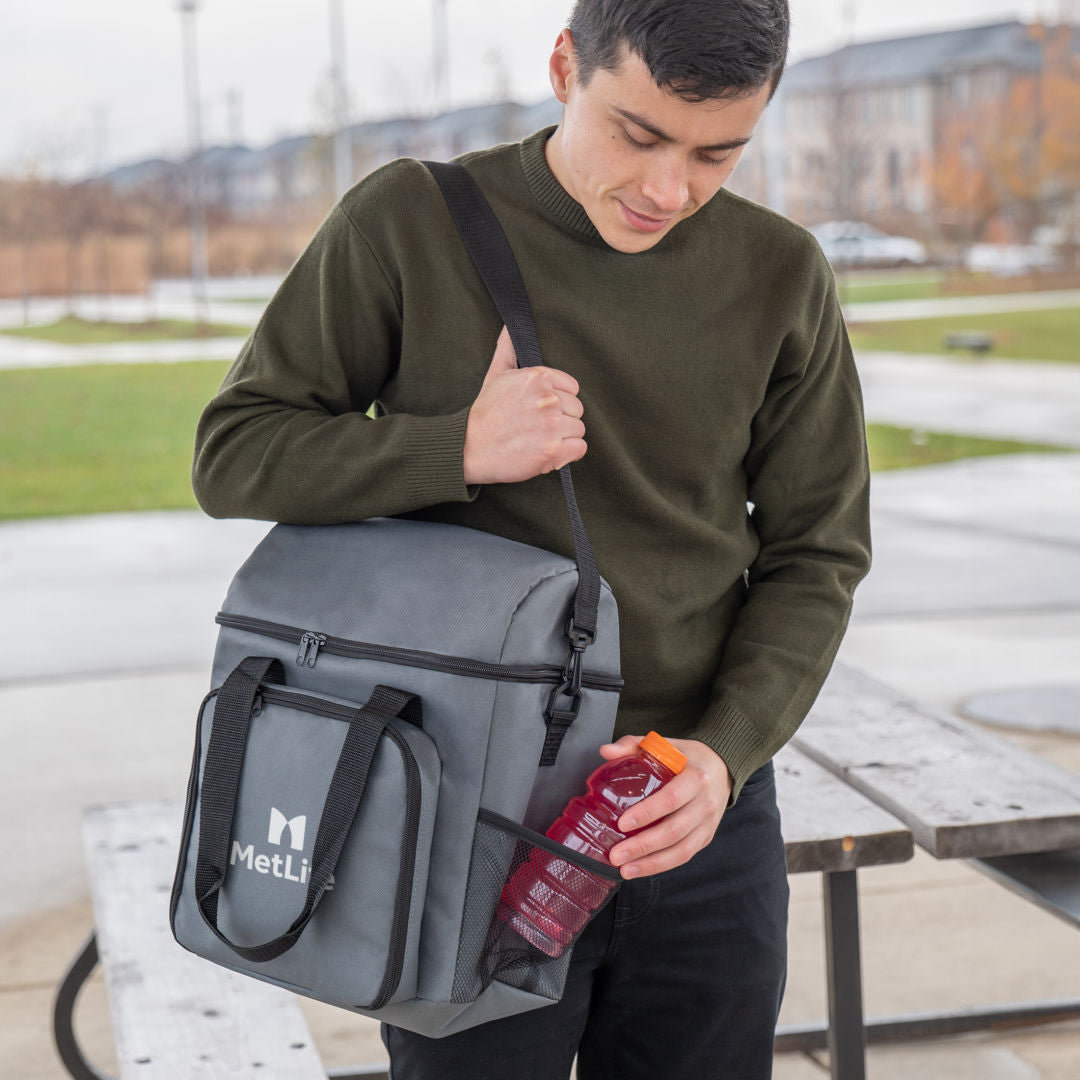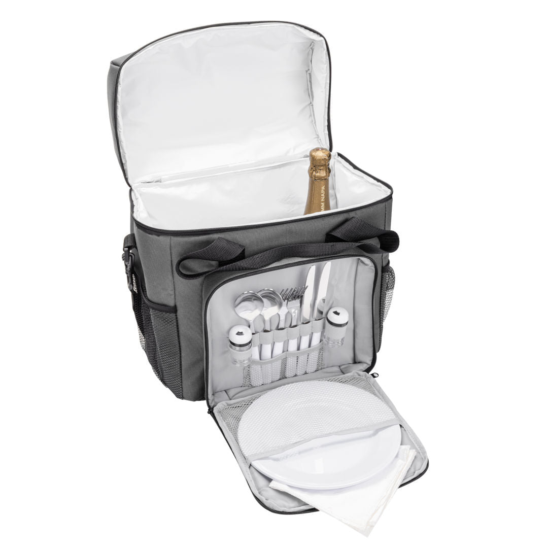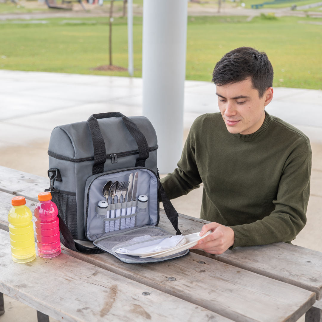 Ce sac de pique-nique tout-en-un est parfait pour les activités de plein air. Il inclut 2 ensembles de couverts en acier inoxydable (couteaux, fourchettes et cuillères), 1 salière et 1 poivrière, ainsi que 2 assiettes pour une expérience culinaire complète. Son compartiment principal avec fermeture à glissière est doublé de PEVA pour conserver les articles au frais, tandis que la poche avant organise soigneusement vos couverts, assiettes et assaisonnements. Avec 2 poches latérales en filet, 2 poignées de transport et 1 grande bandoulière, ce sac offre à la fois commodité et style pour votre prochain pique-nique ou sortie. Assez grand pour contenir des bouteilles de vin. Dimensions 17 x 14 pouces